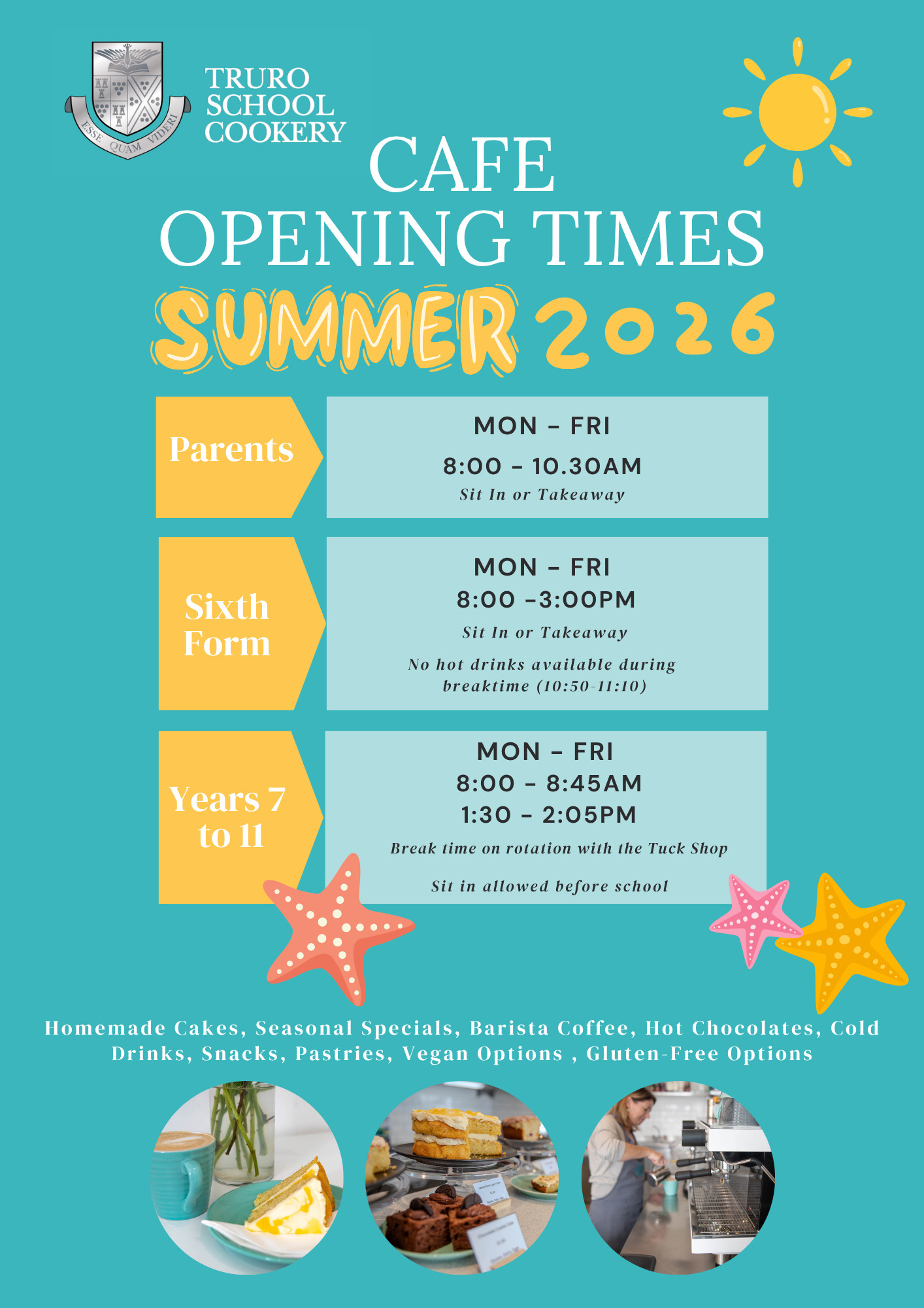 The Café at Truro School Cookery is now open for all of your coffee and cake needs! You will find a warm welcome and an enticing menu, including Origin Coffee, Cornish tea, and a wide range of homemade bakes and goodies. From brain-boosting breakfasts to afternoon pick-me-ups we have something for everyone. We are open Monday to Friday during term time.